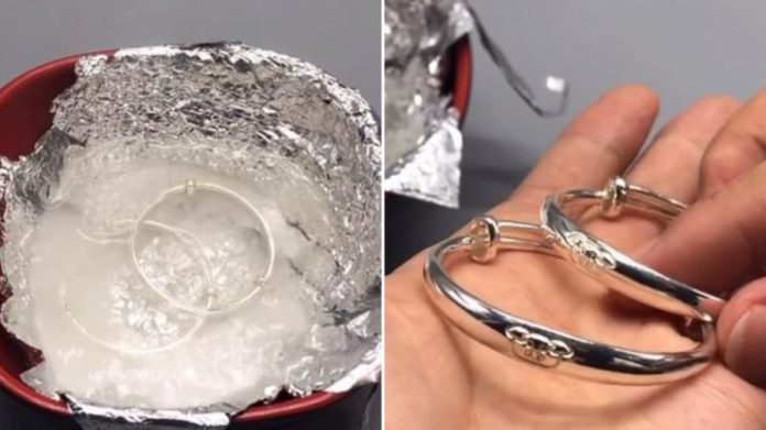 Giấy bạc/giấy nhôm kết hợp với nước muối nóng sẽ giúp loại bỏ lớp oxy hóa trên bề mặt đồ trang sức. Nhờ đó, món đồ sẽ sáng bóng trở lại.