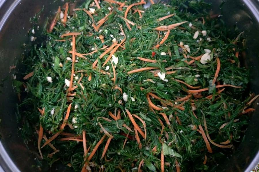 – Bạn dùng tay trộn sẽ giúp rau ngấm gia vị tốt hơn. Bạn lưu ý là cần thử rau nhót rồi mới nêm thêm muối vì bản thân rau nhót đã có vị hơi mặn. Nếu không thử qua rất dễ khiến món ăn trở nên quá mặn.