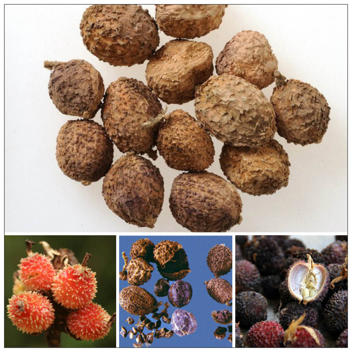 Quả nang hình trứng hoặc gần hình cầu, đường kính 1,3 – 2cm, có gai nhỏ, chia 3 ô, quả màu tím nâu hay tím hồng, gần chín chuyển sang màu tím đen; hạt có áo, hình đa diện, đường kính 3 – 4 mm, màu nâu đen.