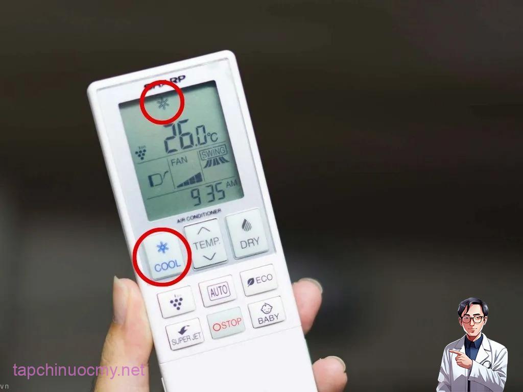 Bước 2: Bật chế độ MODE trên điều khiển của điều hòa, sau đó chọn chế độ Cool (Làm mát). Đây là chế độ thông dụng nhất của điều hòa với biểu tượng là hình bông tuyết.