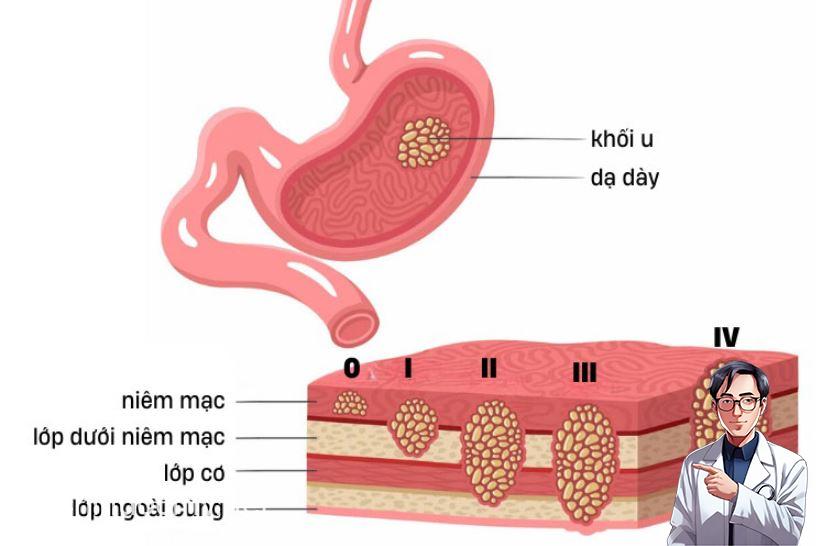 Giai đoạn 0: tế bào ung thư mới xuất hiện ở lớp niêm mạc dạ dày. Đây còn được gọi là ung thư biểu mô, là giai đoạn sớm của ung thư dạ dày.