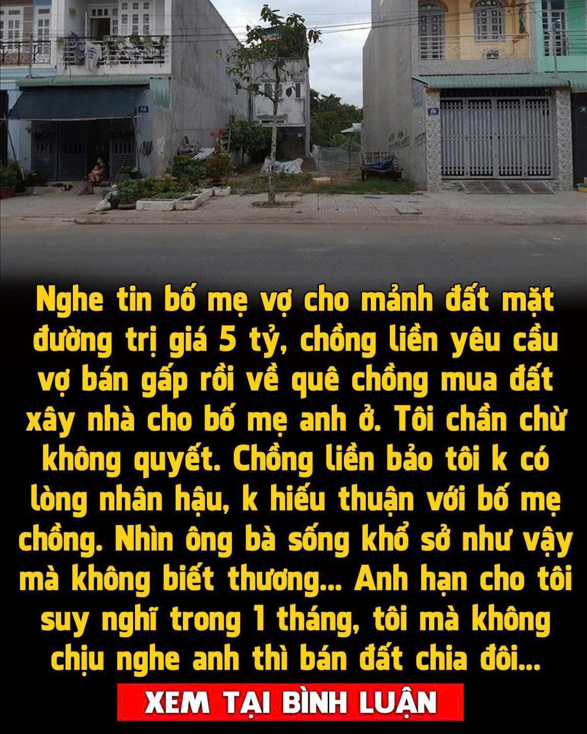 Tôi chần chừ không quyết. Chồng liền bảo tôi không có lòng nhân hậu, không hiếu thuận với bố mẹ chồng. Nhìn ông bà sống khổ sở như vậy mà không biết thương. Anh còn bảo dù có xây nhà ở mảnh đất bố mẹ tôi cho, anh cũng không thích. Anh muốn tìm một nơi yên tĩnh, rộng rãi để ở cả đời.