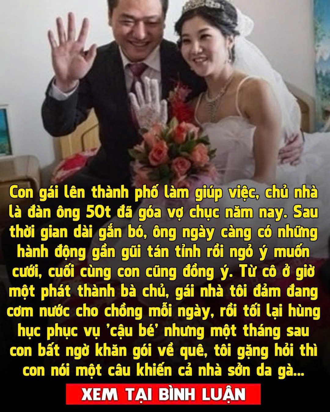 Con gái tôi lên thành phố làm giúp việc, chủ nhà là người đàn ông 50t đã góa vợ chục năm nay. Sau thời gian dài gắn bó, ông ngày càng có những hành động gần gũi tán tỉnh rồi ngỏ ý muốn cưới, cuối cùng con cũng đồng ý.