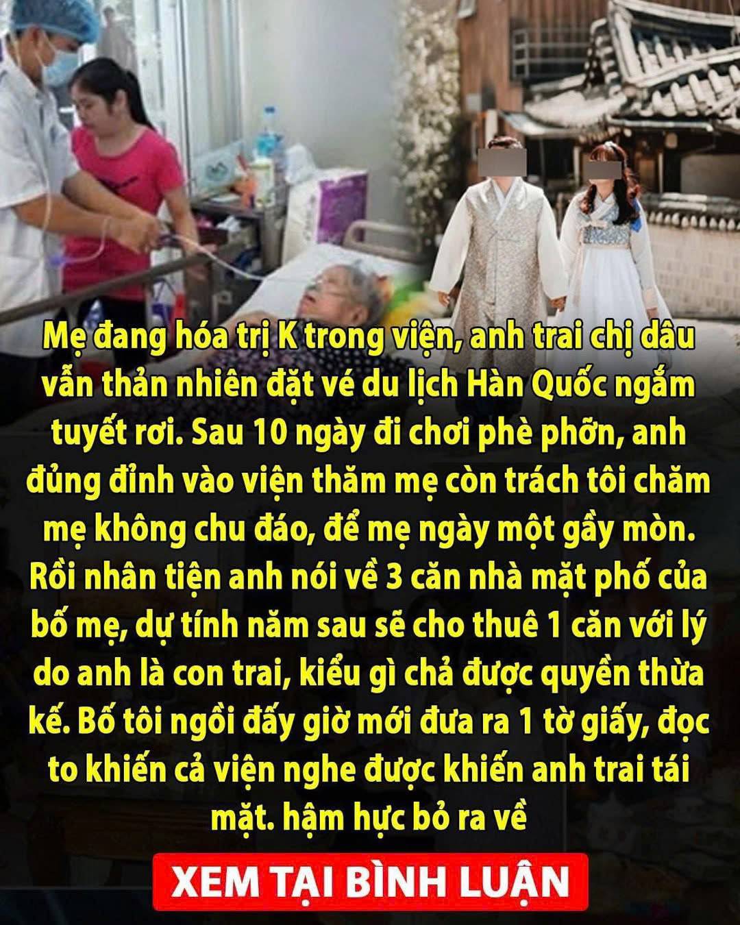 Mẹ ốm, cả nhà anh trai vẫn đi chơi để mình tôi chăm sóc mẹ. Lúc về anh giả bộ khóc lóc trách em gái đủ điều, cốt để lấy hết 3 căn nhà của ông bà