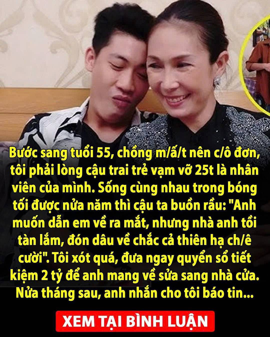 Bước sang tuổi 55, chồng m/ấ/t nên c/ô đơn, tôi phải lòng cậu trai trẻ vạm vỡ 25t là nhân viên của mình. Sống cùng nhau trong bóng tối được nửa năm thì cậu ta buồn rầu: “Anh muốn dẫn em về ra mắt, nhưng nhà anh tồi tàn lắm, đón dâu về chắc cả thiên hạ ch/ê cười”. Tôi xót quá, đưa ngay quyển sổ tiết kiệm 2 tỷ để anh mang về sửa sang nhà cửa. Nửa tháng sau, anh nhắn cho tôi báo tin…