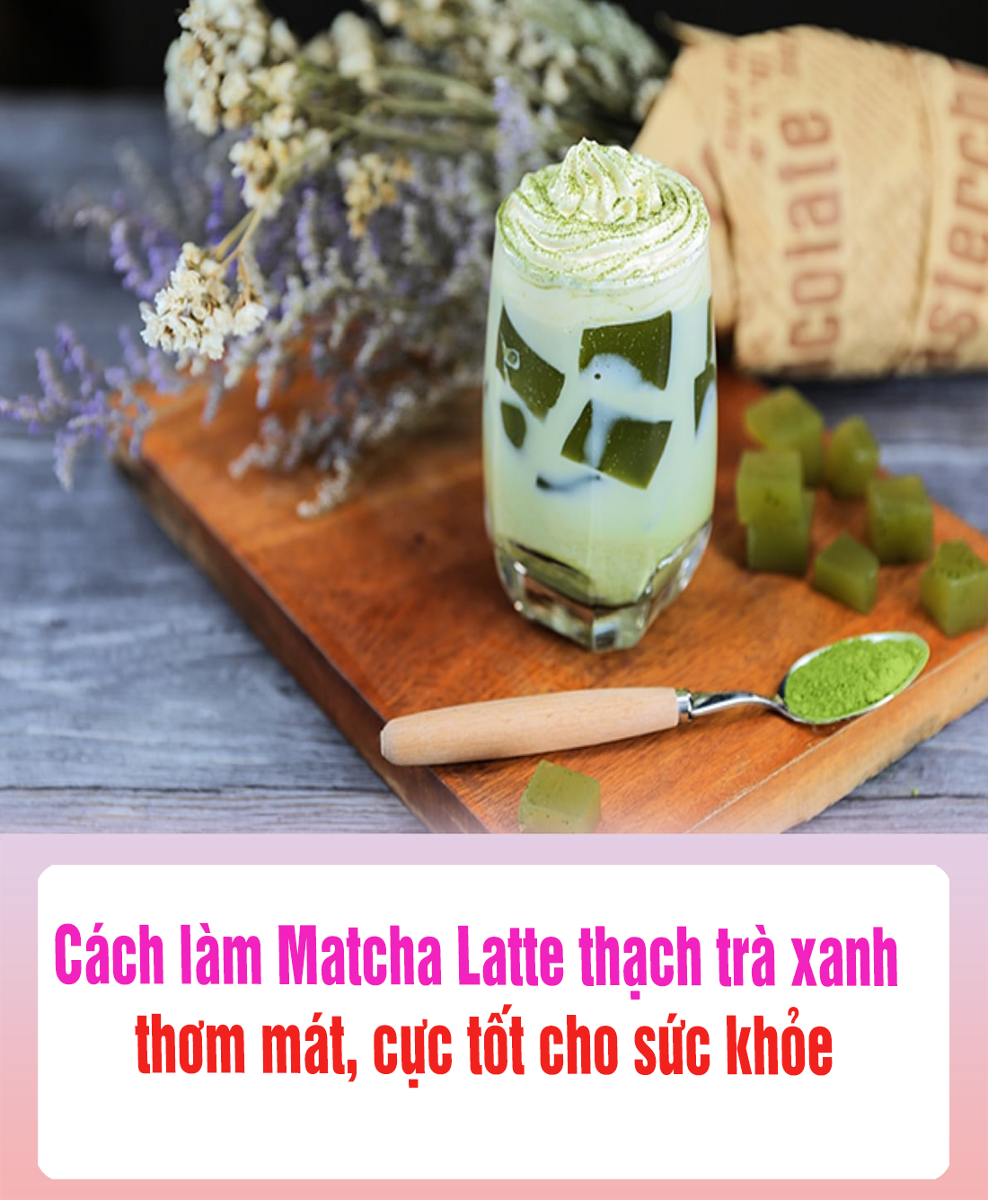 Cuối cùng bạn cho thạch trà xanh vào ly, rồi thêm phần sữa matcha đã đánh bọt vào, thêm kem tươi tuỳ thích để tăng thêm hương vị.